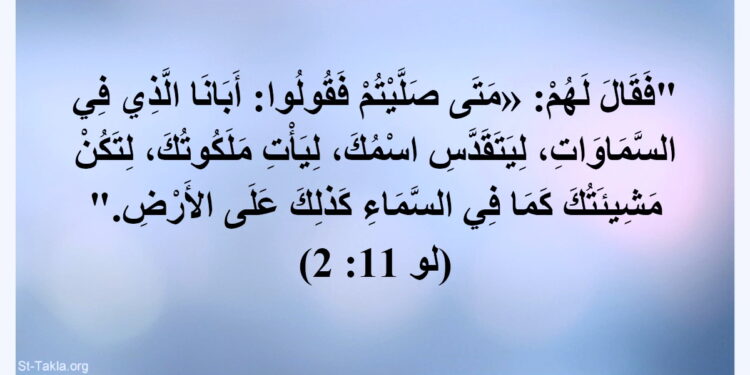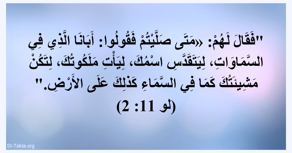 2759- “وكان،ذات يوم،يصلي في موضع ما.فلما فرغ، قال له واحد من تلاميذه:”يا رب علمنا أن نصلي كما علم يوحنا تلاميذه”(لو 1:11).فجوابا عن هذا السؤال أودع الرب تلاميذه وكنيسته الصلاة المسيحية الأساسية.وقد ذكر القديس لوقا نصا لها مختصرا (من خمس طلبات) ،ولمتى نصا أطول (سبع طلبات) .والتقليد الكنسي الليترجي حفظ نص القديس متى:(13:6-9).
