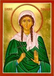 ولدت يوليانا في نيقوميدية من أسرة شريفة. آمنت بالمسيح عن يد أحد المسيحيين. خطبت لرجل شريف ورفضت أن تتزوج. عندئذ استشاط أبوها غيظاً وضربها بقساوة بربرية. وجاء بها إلى الحاكم الويزيوس فأمر بتعذيبها، فجلدت جلداً عنيفاً، حتى سالت دماؤها مدة ست ساعات. شفاها الله من جراحها.