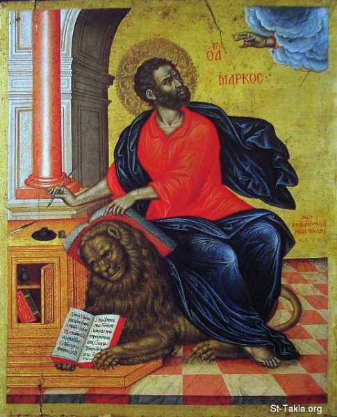 واجتمع له الاسمان معًا في (أع 12:12، أع 25:12، أع 37:15). نشأ في أسرة يهودية متدينة في بلدة القيروان إحدى الخمس مدن الغربية في ليبيا، وأمه تدعى مريم التي كانت إحدى المريمات التي تبعت السيد المسيح، وأبوه أرسطوبولس (ابن عم زوجة بطرس الرسول)، كما أن القديس مرقس هو ابن أخت برنابا الرسول (كو10:4). هو الذي ورد في التراث أنه كاتب الإنجيل الثاني المعروف باسمه. وقد ذكر أن مرقص استمد إنجيله من بطرس الرسول. وتبين المصادر أن الإنجيل وضع بناء لطلب أهل رومية الذين رغبوا في أن يكون لهم سجل مدوّن لما سبق أن سمعوه من الرسول بطرس. القدّيس الرسول مرقص، هو ابن أخت الرسول برنابا، يشار إلى أن بطرس الرسول كان عارفاً بعائلة مرقص منذ وقت مبكر. فمن سفر أعمال الرسل نعلم أن بطرس بعدما أخرجه ملاك الرب من السجن قصد البيت الذي اعتاد كثير من التلاميذ والمؤمنين أن يجتمعوا فيه للصلاة، هذا البيت هو “بيت مريم أم يوحنا الملقب مرقص”. وبداية خدمة مرقص مع بولس كانت بعدما استكمل برنابا وبولس الخدمة في أورشليم. يومذاك أخذا معهما مرقص في طريق عودتهما إلى إنطاكية. وأخذا معهما مرقص إلى قبرص خادماً، ومذ ذاك أخذ يساهم في عمل الكرازة. ثم رجع إلى أورشليم رافضاً مرافقتهما إلى آسيا الصغرى، ثم عاد وامتدّ إلى هناك وصار معروفاً عند الكثيرين من مؤمني آسيا الصغرى. وهذا الانطباع يستشف من رسالة بطرس الرسول الأولى التي وجهها إلى المتغرّبين من شتات البنطس وغلاطية وكبدوكية وآسيا وبيثينية. وفيها يبلغهم سلام مرقص عليهم. الإنجيلي مرقص كان أول من أرسل إلى مصر ونادى هناك بالإنجيل الذي كتبه وأسّس الكنائس في الأسكندرية أولاً، وهو الذي أسّس الكرسي الإسكندري. وادّعت مدينة أكويليا، شمالي إيطاليا، ادّعت أن مرقص هو الذي أسّس الكنيسة فيها. و بجانب كرازته للديار المصرية، كرز في اليهودية وفي جبل لبنان وفي أنطاكية (سوريا) (أع 27:11-30، أع15:12، أع 37:15)، وفي قبرص (أع 4:13، 5، أع 39:15) إلى أن وصل برجة بمفيلية (أع13:13)، أيضًا كرز في روما مع بولس الرسول (فل24، 2تي11:4). ويفيد القدّيس الشهيد دوروثاوس الصوري، أن القدّيس مرقص قضى شهيداً في الإسكندرية. وقد ورد أن جسد القدّيس كان محفوظا في فوكولوس في كنيسة بنيت عام 310 م. ومن المرجح أن جسده بقي يكرم هناك في القرن الثامن الميلادي، أيام المسلمين، لكن جماعة من البندقية الإيطالية سرقته ونقلته إلى بلادها في حدود العام 815 م. راهب فرنسي، اسمه برنابا، قصد الشرق رحّالة عام 870 م، ذكر أن جسد القدّيس مرقص لم يكن في الإسكندرية، يومذاك، لأن البنادقة نقلوه إلى جزرهم. يشار إلى أن مرقص الإنجيلي هو شفيع البندقية الإيطالية. وقد خربت الكنيسة الأساسية التي أودعت فيها رفات القدّيس عام 976 م, فإن البازيليكا التي أعيد بناؤها تحتوي رفاته وفسيفساء مميّزة عن حياة القدّيس وموته ونقل رفاته. والقدّيس مرقص الإنجيلي شفيع لصنّاع الزجاج وكتاب العدل ومربي الأبقار الأسبان والأسرى. ويشار أيضا إلى ان رمز إنجيل مرقص هو الأسد المجنّح. وهذا الاختيار, لأن إنجيل مرقص تكلّم على الرفعة الملكية للمسيح ولأن مستهّل القول فيه هو عن يوحنا المعمدان صوت صارخ في البرّية.