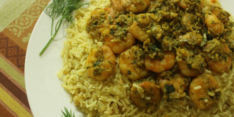 - نضع البقدونس مع البصل ثم نضيف الروبيان المقشر.