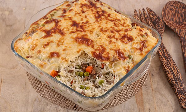 - يخلط جميع ما سبق ثم يضاف على الوجه البشاميل والجبن المبشور ويوضع في الفرن لمدة 30 دقيقة في درجة حرارة متوسطة (375 ف – 180 س).