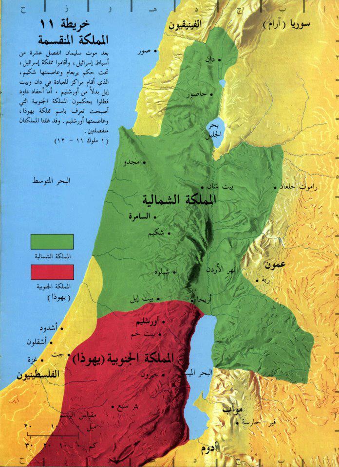 بعد موت سليمان انفصل عشرة من أسباط إسرائيل و أقاموا مملكة إسرائيل , تحت حكم يربعام و عاصمتها شكيم , الذي اقام مراكز للعبادة في دان و بيت إيل بدلاً من أورشليم . أما أحفاد داود فظلوا يحكمون المملكة الجنوبية التي أصبحت تعرف باسم مملكة يهوذا , و عاصمتها أورشليم . و قد ظلتا المملكتان منفصلتين . ( 1 ملوك 11 – 12 )