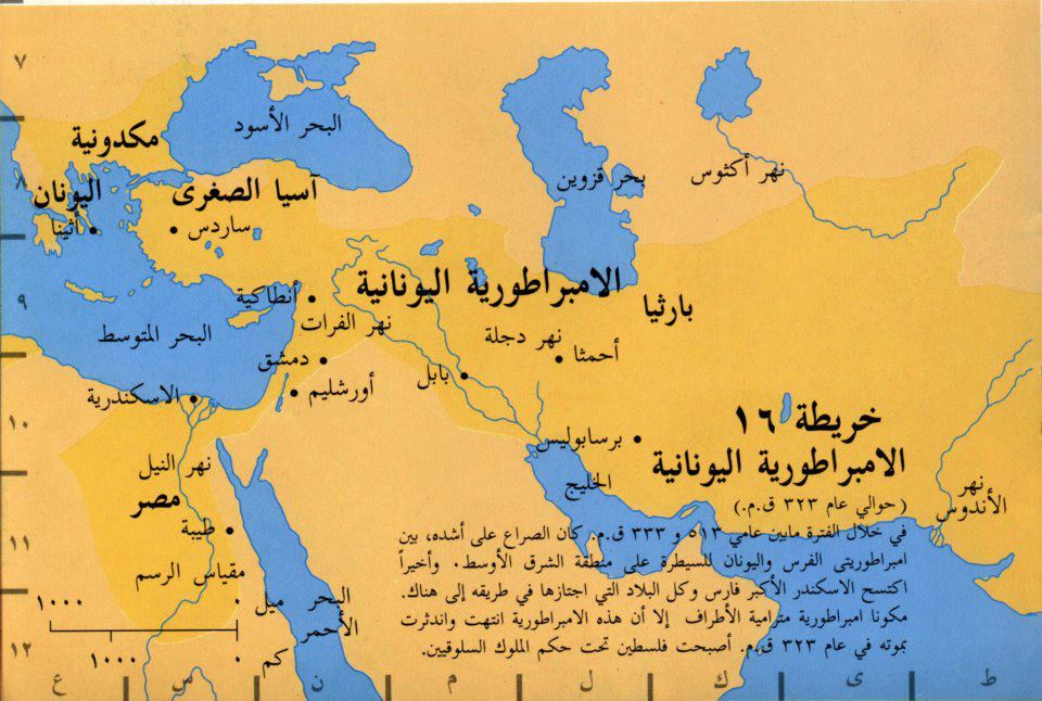 ( حوالي عام 323 ق . م . ) من خلال الفترة مابين عامي 513 و 333 ق . م . كان الصراع على أشده , بين أمبراطوريتي الفرس واليونان للسيطرة على منطقة الشرق اﻷوسط . و أخيراً اكتسح الأسكندر اﻷكبر فارس و كل البلاد التي اجتازها في طريقه إلى هناك. مكوناً أمبراطورية مترامية اﻷطراف إلا أن هذه اﻷمبراطورية انتهت واندثرت بموته عام 323 ق . م . أصبحت فلسطين تحت حكم الملوك السلوقيين.