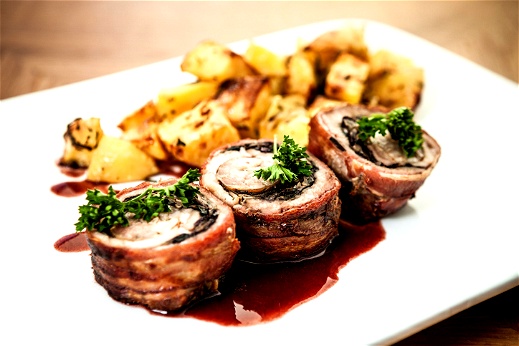 - تفرد شرائح اللحم ثم نبدأ بوضع الحشوة فيها ثم نبرمها ونحرص على تغطية جوانب الشريحة حتى لا تقع منها الحشوة.