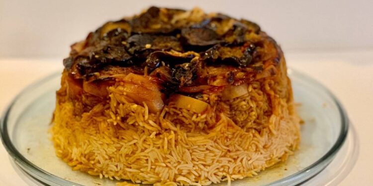 مقلوبة فلسطينية باللحمة ويمكن عملها بالدجاج ،وقد أضفت عليها عدة أنواع من الخضار، تقدم مع اللبن والسلطة.