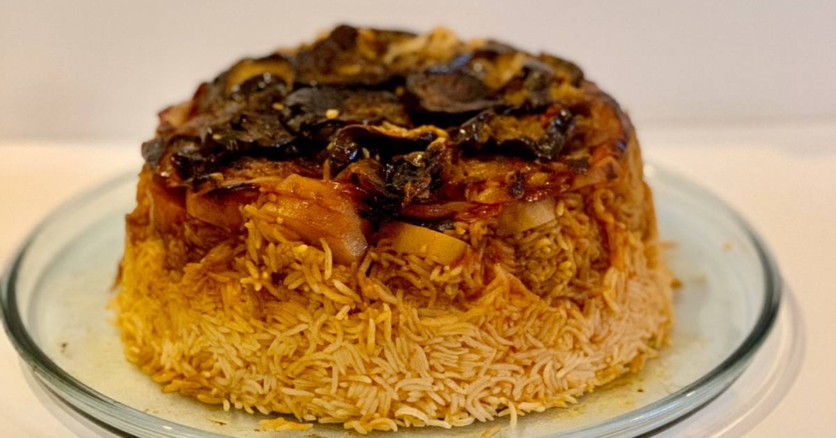مقلوبة فلسطينية باللحمة ويمكن عملها بالدجاج ،وقد أضفت عليها عدة أنواع من الخضار، تقدم مع اللبن والسلطة.