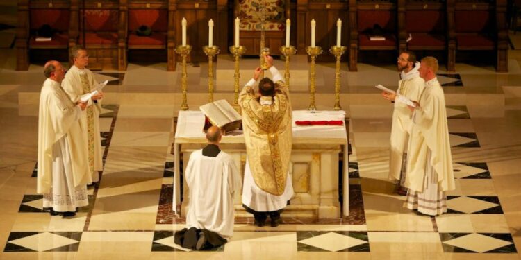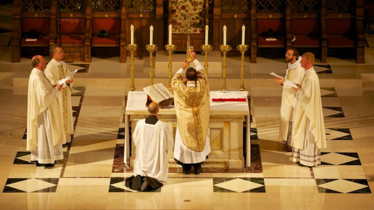 (le prêtre cummunie a corps et sang du Christ)