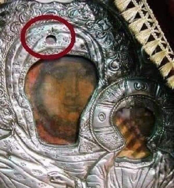 ويبدو في أيقونة السيدة العذراء ثقب في جبينها من رصاصة الرجل التركي . هذه الأيقونة موجودة اليوم في شمال إيفيا.