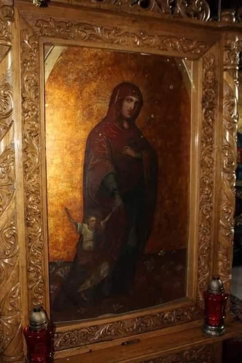 رُسمت الأيقونة عام 1875 إثر وحي من أحد الرهبان. إنها ترمز إلى دخول العذراء إلى الهيكل ، جنباً إلى جنب مع ابنها يسوع. هناك حقيقة خاصة جداً وهي أنك تعجب بالأيقونة من أي ركن من أركان الدير تشعر أن والدة الإله تنظر إليك مباشرة في عينيك.