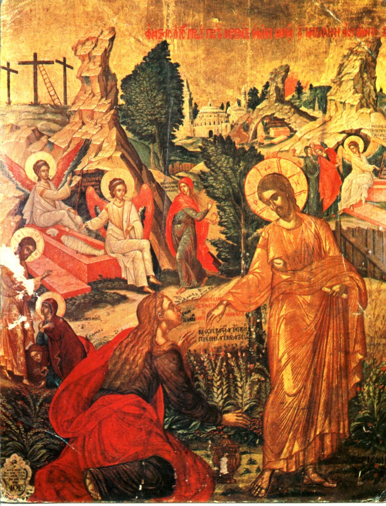 المشهد الأماميّ والرئيس في الأيقونة: مريم المجدليّة ويسوع المسيح. يظهر المسيح بثوبٍ مذهّب. إنّه في مجده، وتظهر على يديه آثار المسامير، والثوب يكشف عن جنبه المطعون. وتصوّر مريم المجدليّة تهمّ بالإمساك بيسوع بعد أن عرفته، وأمام وجهها الحوار مع يسوع. الكلام باللون الأحمر هو كلامها: «سيّدي، إذا كنتَ أنتَ قد ذهبتَ به فقل لي أين وضعته، وأنا آخذه». والكلام باللون الأسود هو كلام يسوع: «لا تمسكيني، إنّي لم أصعد بعدُ إلى أبي».