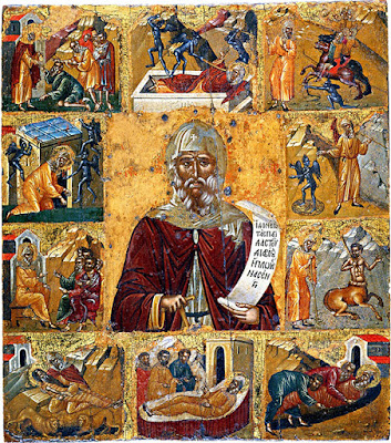 في الوسط، القدّيس أنطونيوس يعطي توصياته الأخيرة لتلاميذه قبل وفاته. شعر القدّيس أنطونيوس باقتراب نهاية رحلته على هذه الأرض، فجمع تلاميذه وأوصاهم قال: «إجتهدوا كي تتّحدوا بالله أوّلاً، ثمّ بقدّيسيه، فيستقبلونكم بعد موتكم كأصدقاء معروفين في الأخدار السماويّة».