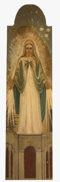 نرى العذراء متشحة بثوب ابيض نوراني وسط هالة نورانية وهي تنظر إلى الأسفل وتفتح يدها لتبارك الجموع التي كانت تنتظرها تحت الكنيسة وقد استوحى الفنان هذا المنظر من الصورة الحقيقية التي كانت تظهر بها العذراء فعلا في الزيتون وراها الملايين