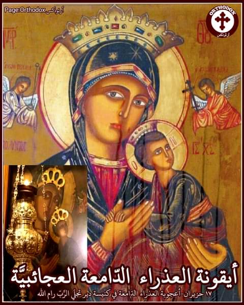 ١٧ حزيران تذكار أيقونة العذراء الطاهرة الدامعة العجائبيَّة. تتواجد أيقونة العذراء الطاهرة موجودة في دير تجلي الرب برام الله، فلسطين. هذه الأيقونة عجائبيّة وقد تمّ شفاء الكثيرين بمجرّد مسحهم بالميرون (الزيت المقدس) الذي تذرفه الأيقونة.