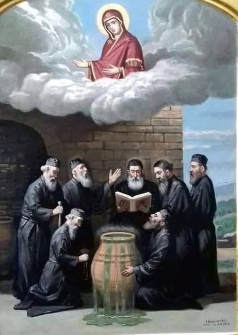 المعجزة التي قامت بها في ديرها على جبل آثوس في الوقت الذي كان فيه الوعاء فارغ من الزيت وصلى الراهب أغاثون إلى نعمتها وإمتلأ الأبريق بالزيت.