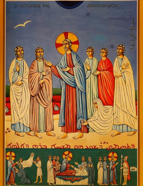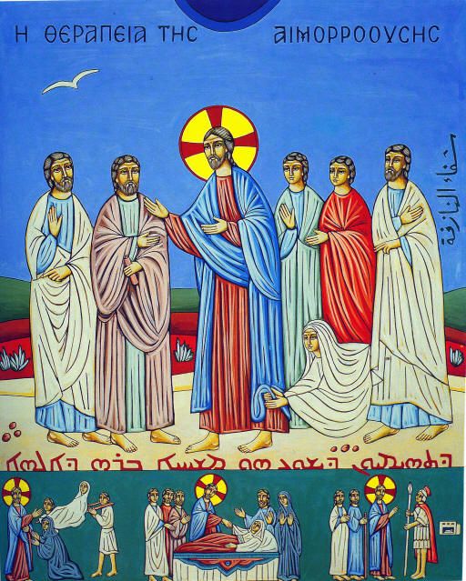 يندرج شفاء المنزوفة في سياق ذهاب يسوع إلى بيت إبنة يائيرس نزولاً عند طلب أبيها الّذي سأل بإيمان الشفاء لإبنته. فيما يحمل يسوع قوة الحياة والقيامة إلى هذه الصبيّة، نرى المنزوفة تتخطّى حشود الجموع لتصل إليه فتغتصب منه الحياة، هو رب الحياة. وهذا مايظهر جليا في أسفل الأيقونة.