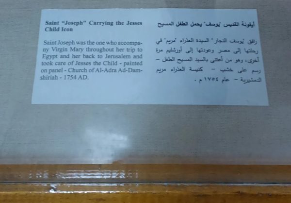 لوحة خشبية عمرها 3 قرون بمتحف كوم أوشيم تزين الدور العلوي من متحف كوم أوشيم بمحافظة الفيوم، والذي يقع بطريق القاهرة – الفيوم الصحراوي، وتم افتتاحه منذ أيام وهي أيقونة القديس يوسف النجار خطيب السيدة مريم، وهو يحمل السيد المسيح وهو طفلا صغيرا بين يديه، وذلك عندما رافقهما فى رحلتهما إلى مصر، وذكر على اللوحة أنها من كنيسة العذراء الدمشيرية وتاريخها يعود لعام 1754.
