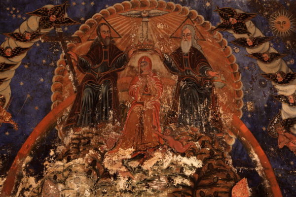 أمّا في الداخل فتعلو مذبحها صورة “المسيح الضابط الكلّ” وهو يتأبَّط الكتاب المختوم بسبعة أختام كمافي رؤيا يوحنّا، أي الكتاب المقَّدس بعَهْدَيه، وعن يمينه وشماله العذراء، واسطفانوس أول الشهداء، وفي الحنيَّتَين الصغيرتَين صورة للقديس يوسف حاملاً الطفل الإلهيَّ بيُسراه بينما يَدلُّ بيُمناه على مهنته كنجّار. وهناك أيضاً صورة للنبي دانيال مُلقى في جبّ الأسود. وعلى الحائط الشمالي توجد صورة للسيّدة العذراء يُتوّجها الثالوث الأقدس، وهي جِدرانية تُسمّى “نياح العذراء”، وتُشكّل تحفة الكنيسة إذ تَتَجلّى فيها السيّدة العذراء بثوبها الأرضيّ ووشاحها السماويّ واصلةً بهما ما بين دائرتَي الارض والسماء. وهي، بانحناءة رأسها وسمرة وجهها الشرقيّ الرائع، من أجمل الرؤى السماوية. إنها تنتقل من مرقدها الذي تحوَّل الى مذبحٍ تنيره أرزتان كأنهما شمعدانان، ويُكرّمها سُجوداً تسعة بطاركة في ليتورجية أرضية تقابلها في السماء ليتورجية الملائكة. ويعلو الجدرانية القمر والشمس.. رمزاً لنهارٍ أبديّ. ويتمُّ التتويج على وقع الأناشيد يُردّدها الروح القدس بالكرشونية- السريانية: ” تعالي معي من لبنان أيتها العروس فتتكلَّلين”.