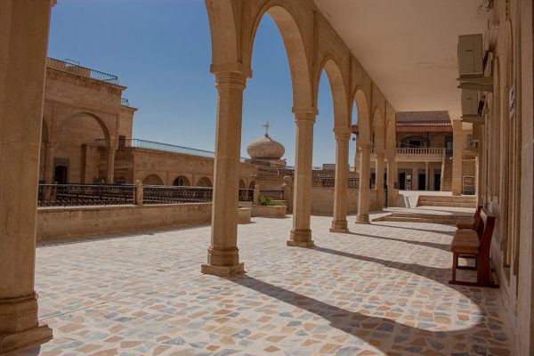 لسنا بحاجة لأن نطرق البوابة المفتوحة على مدار ساعات النهار والمساء، يأخذنا رواق يذكرنا انحناء أقواس سقوفه بأبنية القصر العباسي ببغداد أو القصر المعشوق في سامراء وبعمارة العصر القوطي، بل أقدم من ذلك بكثير، بقصور نينوى التي تنتمي إليها منطقة الدير تاريخيا و حضاريا وجغرافيا، الأعمدة المرمرية المزخرفة بأشكال نباتية تحيط الزائر من الجانبين نحو باحة مفتوحة إلى السماء، نمر بباب عتيق يفضي إلى (المغارة الكبيرة)، وهي عبارة عن صهريج كبير وقديم لخزن المياه حيث كان الدير غالبا ما يتعرض لحصار القوات الغازية أو لحصار الطبيعة.