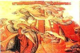 نرى بالقربِ من يوحنَّا حاملتي طيبٍ في اللوحة: الأولى مُنشغلة بمؤساة مريم، مُقبِّلةً يدها، واضعة إناء الطيب على الأرض بقربِها؛ والثانية فوافقة حاملة قارورة الطيب منتظرة انتهاء عمليّة الإنزال لتعبّر عن محبَّتِها بدهنِها الجسد بالمرّ الزكيّ الرائحة، الغالي الثمن