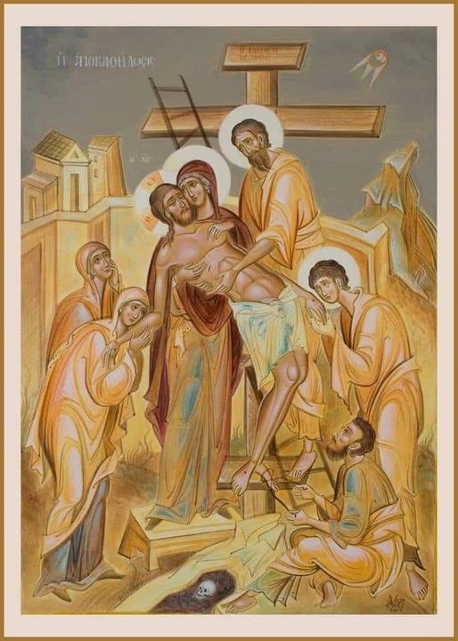 نرى يوسف المتّقي سانداً قدمي السيّد بخشوع بينما نيقوديموس يتسلّق السلّم يعاونَه بشغف. نتساءل من هو الشخص الثالث إلى اليسار، الواضع إبطَ يسوعَ على عنُقهِ؟ قد يكون إنساناً سخّرهُ يوسف، على غرار سمعان القيرواني، الذي ساهم في حمل خشبة المصلوب على طريق الجلجلة، لمساعدته على إنزال الجسد الطاهر عن العود، لأنَّ رداءه يختلف عن رداء الأشخاص الآخرين. عمليّةُ الإنزالِ كانت صعبة بعض الشيء ودقيقة لأنَّ الجسد مُسمَّر ويحتاج عناية خاصَّة؛ ولا يبدو الجسد الطاهر في الأيقونة جامداً، بصلابة الأموات عادة، إنّهُ “مائت كنائم”، ليِّن، مرن.