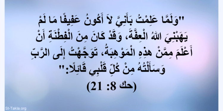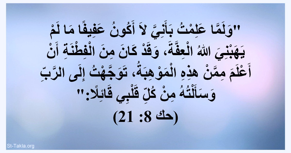 فليحرص إذن كل إنسان علي عفة قلبه وفكره, بما يدخله فيهما من روحيات ومن محبة الخير والعفة. وذلك لكي يصيرًا مصدرًا لكل من عفة اللسان وعفة الحواس وعفة الجسد.