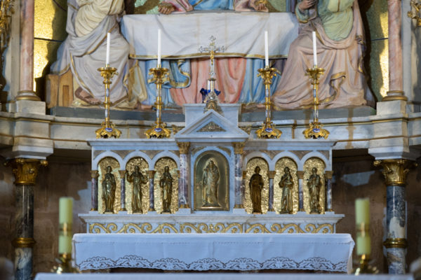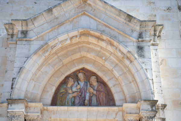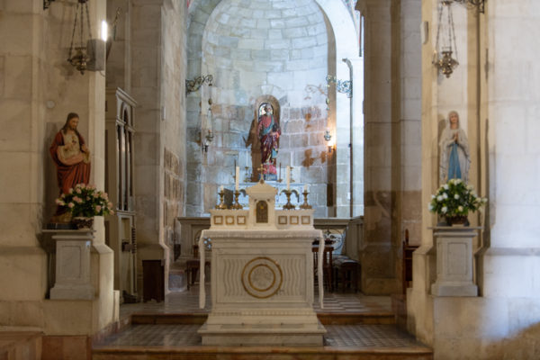 في الكنيسة ثلاثة أروقة، الرواق الذي إلى اليسار يحمي تحت صفائحه الرخامية الحمراء آثار بيت من الحقبة الرومانية يشير إليه التقليد على أنه بيت قلاوبا حيث ظهر يسوع للتلميذين.