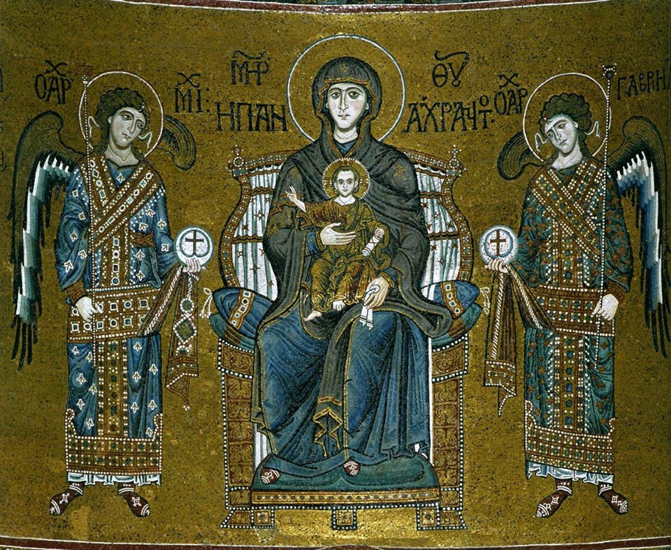 هذا الشكل الملوكيّ لوالدة الإله يترجم مكانتها منذ القدم في المحيط الرومي- القسطنطينيّ، فعاد واعتمد بقوّة مثلًا في فسيفساء تعود للقرن العاشر تظهر والدة الإله مع الرب يسوع المسيح بين الإمبراطورين المسيحين يوستنيانس (٤٨٣-٥٦٥م) وقسطنطين (٢٧٢-٣٣٧م) في كاتدرائيّة ​آيا صوفيا​، وفي فسيفاء لوالدة الإله مع الرب يسوع بين الملاكين ميخائيل وجبرائيل الموجودة في كاتدرائية مونريال سيسيليا–القرن الثاني عشر، وكذلك في أماكن أخرى.