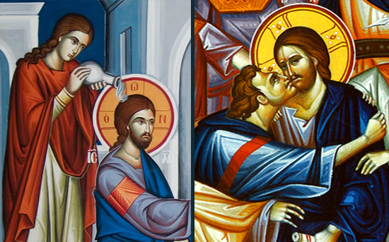 إنّ الزّانية لـمّا مَزَجَتْ بالدّموعِ الطّيبَ الجزيل الثّمَن وأَفَاضَتْهُ على قَدَمَيْكَ الطّاهرَتَيْن وقَبَّلَتْهُما، للحال بَرَّرْتَها. فامنحنا الغفران يا مَن تألّم عنّا وخلِّصْنا.