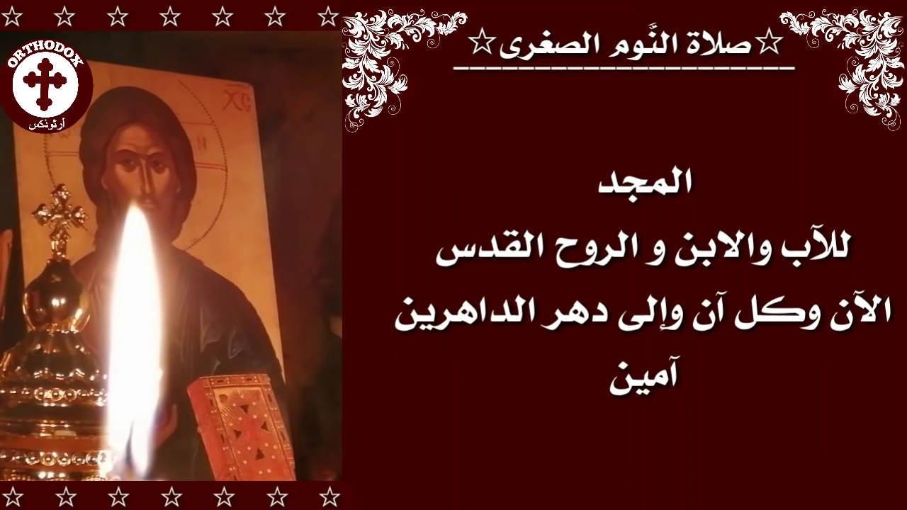 وأعطنا أيها السيد إذ نحن منطلقون إلى النوم، راحة النفس والجسد، واحفظنا من رقاد الخطيئة المدلهم و من كل شهوات الظلام. سكّن جماح الأهواء، أطفئ سهام الشرير المحماة الثائرة علينا بغش، بطل شغب أجسادنا، و أرقد كل معقولنا الأرضي، وامنحنا يا الله عقلاً ساهراً، وفكراً طاهراً، وقلباً مستيقظاً، ونوماً خفيفاً معتقاً من كل تخيل شيطاني. وأنهضنا في وقت الصلاة ثابتين في وصاياك، ومالكين على الدوام في ذواتنا ذكر أحكامك. وهب لنا أقوال تماجيدك طول الليل، لنسبح ونبارك ونمجد اسمك الكلي الإكرام والعظيم الجلال، أيها الآب والابن والروح القدس، الآن وكل آن، وإلى دهر الداهرين، آمين.