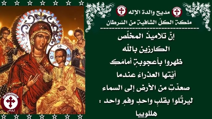 إذ نعرفك يا عذراءُ أنّكِ هيكلٌ فائقُ النقاوة للمخلص، نجثو أمامك أيتها النقية طالبين إليك أن تجعلينا هياكلاً لله نحن المرتلين له: