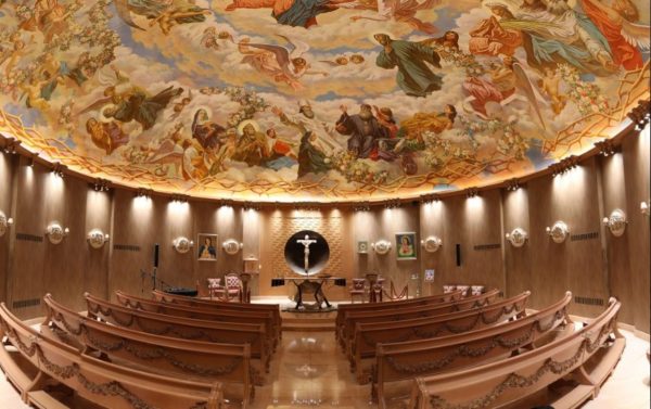 عند دخول المؤمن الكنيسة أول مايلفت نظره هي الجدارية الموجودة في قبة الكنيسة هذه الجدارية تتميز بأنها محاطة بإكليل الشوك حيث يرمز هنا الإكليل للعبور من الأرض إلى الملكوت السماوي وهذا العبور لابد أن يتخلله آلام.