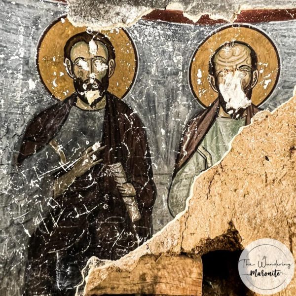 في كنيسة الدير مَذبحان تعلوهما قناطر، ويُغطي جُدرانها كلس أبيض، وفوق الحَنيَّات الثلاث، جِداريات وفُسيفساء اكتشفها الأب موريس تالون عام 1962، وهي تعود إلى الفن البيزنطي. في الحَنيّة الشَماليّة نَجِد جِداريات لخَمسَة رُسل وقديسين، يُرَجَّح أن تكون لإندراوس ولوقا ويوحنّا، ولأسقف مَجهول الاسم… فأسماؤهم كانت مُدوّنة باللغة السِريانيّة إلى جانب كل صورة.