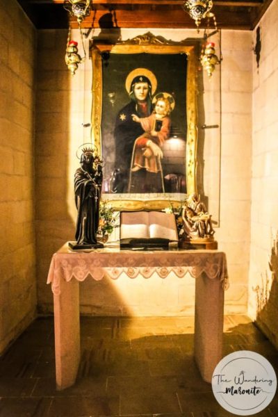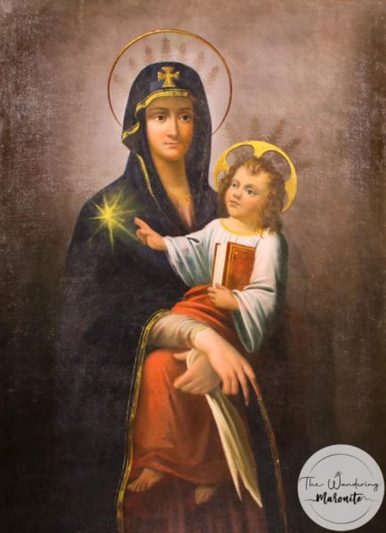 الحجر يرجع الى العهد البيزنطي نقش عليه صليب وقمر يلتفّ بشكل قوس على الشمس، وهذا رمز للعذراء. فمريم، بالنسبة الى يسوع، مثل القمر بالنسبة الى الشمس. منه تستمدّ نورها وهذا الحجر عثر عليه فريق من الموارنة قدموا من منطقة بشري بشمال لبنان بقيادة بعض الرهبان ليقيموا في دير القمر، في بدء القرن السادس عشر.