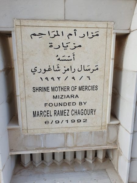 يعود الفضل في بناء هذا المزار إلى “مرسال رامز الشاغوري” المهاجر اللبناني المزياري، الذي يعيش في “اللاّغوس” في نيجيريا مرسال رجل متزوّج وله ثلاثة فتيان وفتاتان ،هاجر منذ ثلاثين سنة إلى نيجيريا، ولكنّه كان يزور لبنان مرّتين في السّنة
