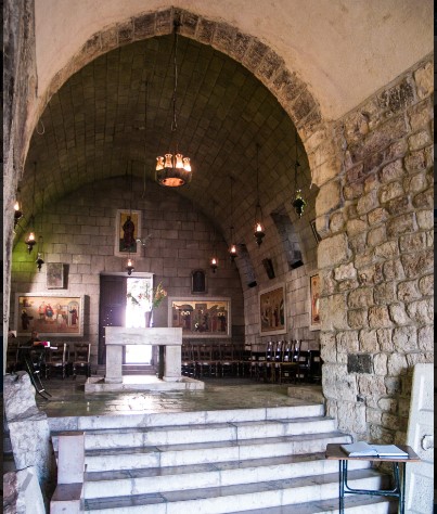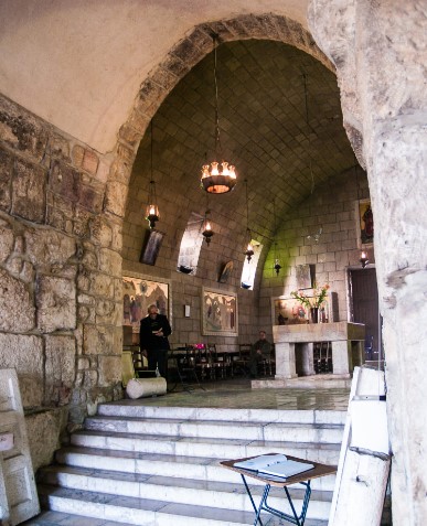 بعد دخول البوابة، والوقوف على العتبة الأولى من المنصة الداخلية لباب كيسان، تُصادفنا حجرة يسارية، مُلئت رفوفها بالصور الدينية والكثير من أنواع الهدايا الصغيرة، والتحف الخشبية المجسدة لقصة السيد المسيح، والديانة المسيحية. وهناك أيضاً نجد باب الحجرة الأثري، البالغ من الارتفاع ما يقارب المتر ونصف المتر، وعمره 25 سنة، صمّمه فنان أرميني، حيث عمل على تزيينه برسوم نافرة ونقوش بالغة الاتقان، مرصعة بالنحاس، تمثل دلالاتها التشكيلية عملية العمادة للسيد المسيح على يد القديس يوحنا المعمدان، وهناك الكثير من النحاتين الذين قدموا إلى زيارة المعبد وحاولوا تقليد الباب بالنحت على الحجر الرخامي، لكنهم فشلوا وتركوا منحوتاتهم غير المكتملة بصمة منهم تدل على انسجامهم ووفائهم للرؤية الحسّية، التي أضافها هذا المعلم الأثري إلى ذاكرتهم الجمالية، ومخزونهم المعرفي.