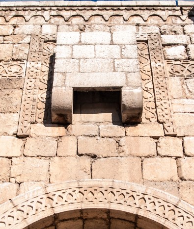 اللافت في التكوين العمراني، بناء قنطرتين بديعتي التركيب فوق بوابة الدخول مباشرة. الأولى وهي الأكبر مزخرفة بدوائر نحتية متداخلة ونافرة، والثانية وهي الأصغر مشرفة بعروق خطية محفورة بدقّة وإتقان، هذا إلى جانب الحجر المنحوت والمتلاصق مع بعضه في بناء الباب بوضعه الكلي.