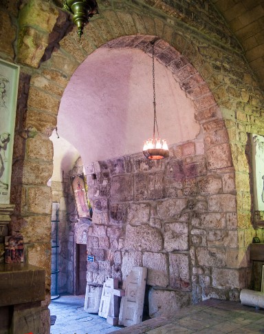وعندما كان العمال يحفرون شرق الباب عام 1939 على بعد خمسة أمتار من السور الحالي، ظهر أمامهم على عمق 15 متراً أساس السور المؤلف من حجارة ضخمة هائلة الكبر. فبنوا عليها حائط السور وجعلوا لها من الداخل فراغاً على طولها يمكّن الزائر من الوقوف والمرور والمشاهدة، وسقّفوه وعملوا منه منزلاً بحيث استُعملت في واجهة البناء بقايا من حجارة جدران الكنيسة والجامع القديمين.
