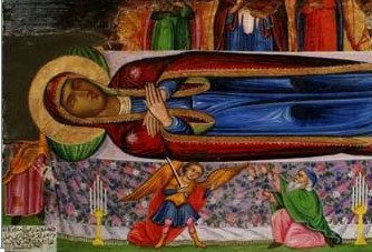 رسم هذه الأيقونة ميخائيل مهنى القدسي عام 1881، وهي أيقونة كبيرة عرضها حوالي 90 سنتمترًا. سنة 1971 أو 1972، احترق قسم من هذه الأيقونة بسبب الشموع الّتي كانت تضاء مقابلها. فأخذها القيّمون على الكنيسة، وعلى قدر معرفتهم أعطوها لأحدهم ليرممها. هذا الأخير قطع القسم العلوي منها وهو القسم المحروق بالإضافة إلى أحد جوانبها. فلم يبقَ ظاهرًا فيها إلا جسد العذراء المسجّى وقسم من الرّسل والجزء السّفلي من السّيّد. وهي أيقونة عجائبية. تُنسب إليها عجائب عدة يتناقل خبرها النّاس.