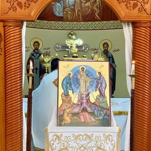 عن يمين السيّد يقف إيليّا النبي الذي يعني اسمه “يهوى إلهّي” أي “يسوع إلهي”.
