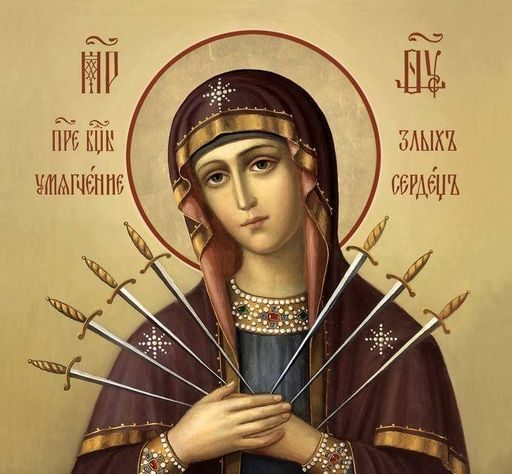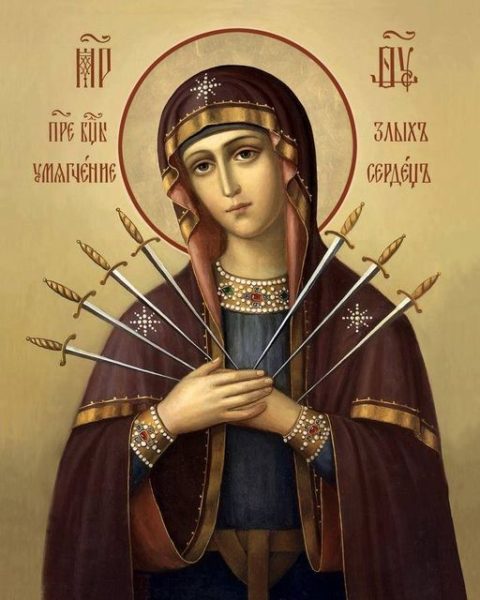الأيقونة ذات سبعة سيوف ولها اسم آخر – “تليين قلوب الشر”. بدأ هذا التكريم في القرن الثالث عشر ويُحيي ذكرى الأحزان التي احتملتها أم الله العذراء بسبب آلام وموت ابنها الإله. وقد درجت العادة على أن تصوَّر سيدة الأحزان في الأيقونة وقلبها مطعون بسبعة سيوف، أذ أن كل سيف يدل على واحد من الاحزان أو الأوجاع الرئيسية التي اخترقت قلب العذراء الكلية القداسة اثناء حياتها على الارض.