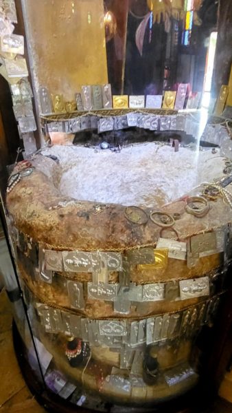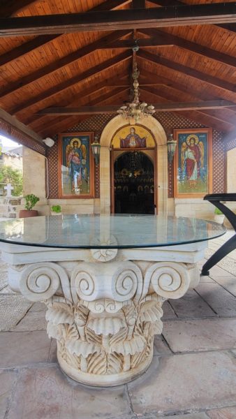 وأكثر ما يلفت النظر وجود جرتين حجريتين أثريتين في داخلها من جهة اليمين واليسار وهما مزينتين بتحف النذور، وكذلك جرن المعمودية الخارجي الذي تعلوه قبة جميلة مزخرفة…