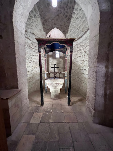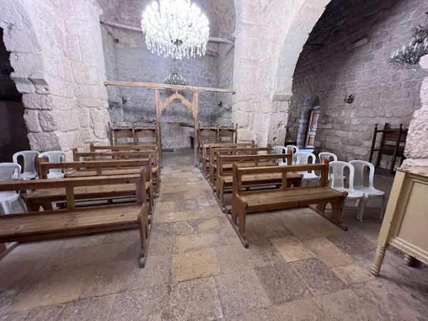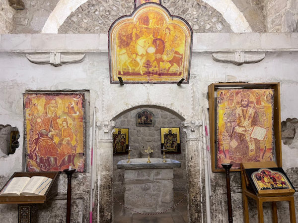 وفي الكنيسة ثلاثة مذابح أحدها من الرخام على شكل نصف دائرة وبحسب الشروحات المحلية يعود هذا المذبح الى فترة ما قبل المسيح أما المذبح الثاني فهو منحوت في الحجر ومستطيل الشكل وقد وضع تحت قبة محفورة في الصخر تجسد السماء ومزينة جدرانها برسم للسيدة العذراء نفذ عام 1824 بحسب التقليد البيزنطي الى جانب مجموعة مهمة جدا من الأيقونات التي رسمها فنانون سوريون وعالميون.