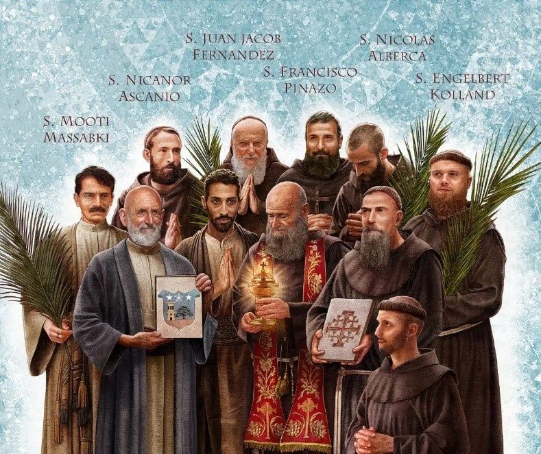 ثمانية رهبان فرنسيسكان مُرسَلين، تركوا بلادهم وتوجّهوا إلى الشرق، ليحملوا إيمانهم ويشهدوا لحبيبهم يسوع، في العالمِ كلّه. أُرسلوا إلى دير الفرنسيسكان في دمشق، المرتبط بروابط روحيّة مع الأراضي المقدّسة. ساروا على خُطى أبيهم فرنسيس الأسّيزي في المحبّة والفقر وأعمال الرحمة، وفتحوا ديرهم وقلوبهم لاستقبال إخوتهم المسيحيّين مُجسّدين الوحدة المسيحيّة. فهم خير مثالٍ يَقتدي به المُرسَلون وخير شفعاء لهم. فلنطلب شفاعتهم لكلّ الرَّهبَنات وبالأخصّ المُرسَلين في العالم!