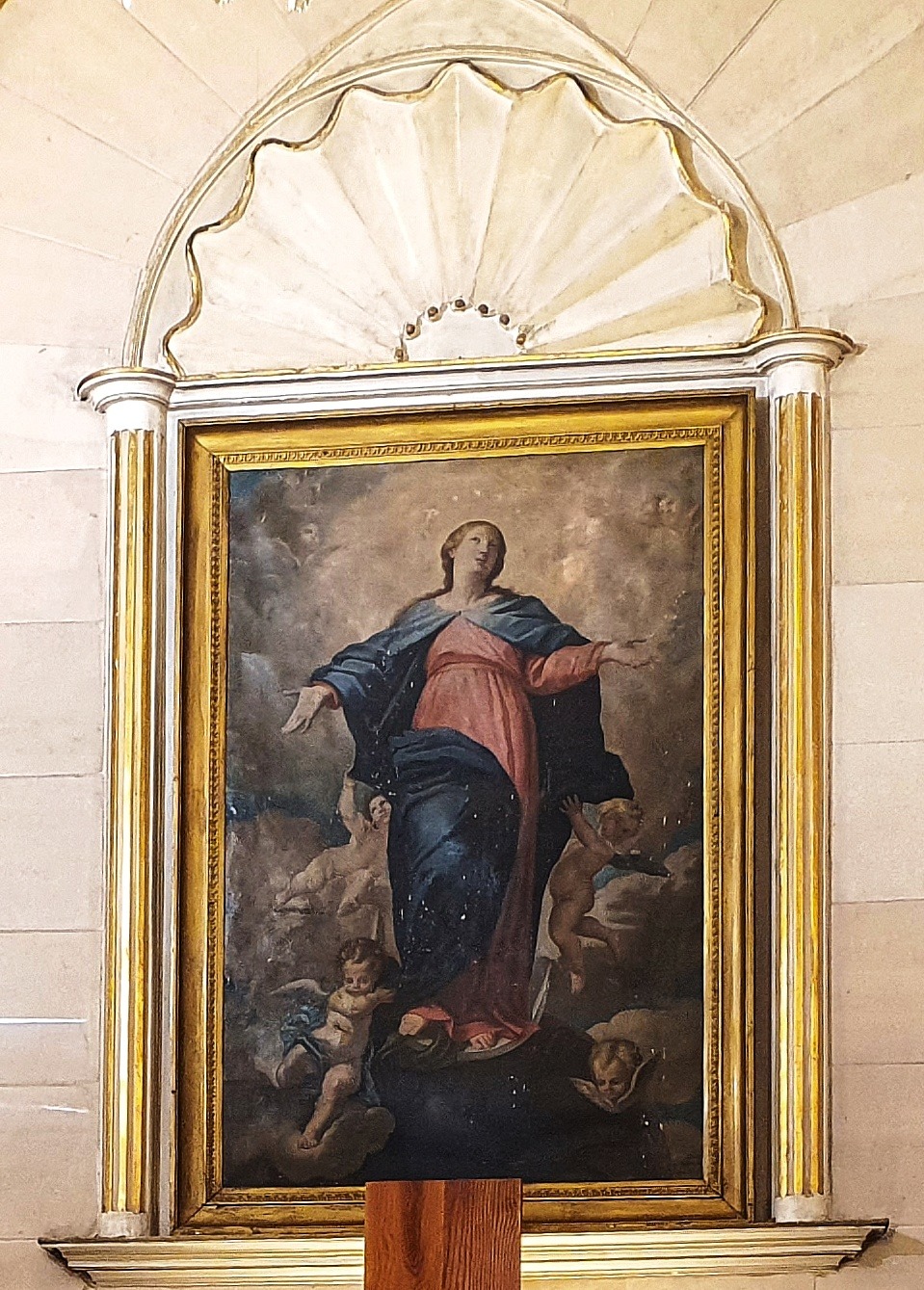 نرى العذراء أثناء صعودها في النفس والجسد رافعة يديها وشاخصة نحو الأعلى حيث الحضور الإلهي وهي في حالة تضرع وصلاة للرب الإله.