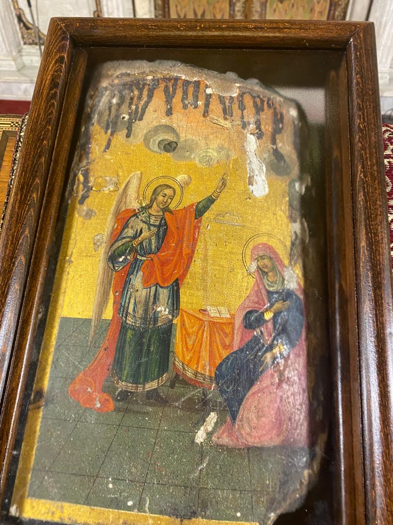 الأيقونة موجودة في الكنيسة المريمية منذ القدم. ولكن في عام 1860 م شهدت دمشق فتنة طائفية بما يسمى بأحداث الطوشة أدت إلى دمار الكنيسة والمقر البطريركي لم يترك شيئ في الكنيسة إلا تخرب. وقد كانت أيقونة البشارة العجائبية خير دليل على هذا الدمار، بقيت الكنيسـة مخربة لمدة ثلاث سـنوات حتى وصول البطريرك الأنطاكي إيروثيوس (1850 م – 1885 م) والذي قام بإعادة بنائها بأموال قامت الحكومة بتقديمها له بالإضافة إلى أموال وصلت إليه من المعتمد البطريركي الأنطاكي في موسكو الأرشمندريت غفرائيل شاتيلا. الأيقونة لا تزال حتى اليوم والتي بقيت بطريقة عجائبية شاهدة على الاعتداءات والخراب الذي حصل في ذلك الوقت.