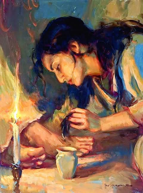 ” وَقَبْلَ الْفِصْحِ بِسِتَّةِ أَيَّامٍ جَاءَ يَسُوعُ إِلَى بَيْتَ عَنْيَا، بَلْدَةِ لِعَازَرَ الَّذِي أَقَامَهُ مِنْ بَيْنِ الأَمْوَاتِ. فَأُقِيمَتْ لَهُ وَلِيمَةُ عَشَاءٍ، وَأَخَذَتْ مَرْثَا تَخْدِمُ، وَكَانَ لِعَازَرُ أَحَدَ الْمُتَّكِئِينَ مَعَهُ. فَأَخَذَتْ مَرْيَمُ مَناً (أَيْ ثُلْثَ لِتْرٍ) مِنْ عِطْرِ النَّارِدِينِ الْخَالِصِ الْغَالِي الثَّمَنِ، وَدَهَنَتْ بِهِ قَدَمَيْ يَسُوعَ، ثُمَّ مَسَحَتْهُمَا بِشَعْرِهَا، فَمَلأَتِ الرَّائِحَةُ الطَّيِّبَةُ أَرْجَاءَ الْبَيْتِ كُلِّهِ. فَقَالَ أَحَدُ التَّلامِيذِ، وَهُوَ يَهُوذَا الإِسْخَريُوطِيُّ، الَّذِي كَانَ سَيَخُونُ يَسُوعَ: «لِمَاذَا لَمْ يُبَعْ هَذَا الْعِطْرُ بِثَلاثِ مِئَةِ دِينَارٍ تُوَزَّعُ عَلَى الْفُقَرَاءِ؟» وَلَمْ يَقُلْ هَذَا لأَنَّهُ كَانَ يَعْطِفُ عَلَى الْفُقَرَاءِ، بَلْ لأَنَّهُ كَانَ لِصّاً، فَقَدْ كَانَ أَمِيناً لِلصُّنْدُوقِ وَكَانَ يَخْتَلِسُ مِمَّا يُوْدَعُ فِيهِ. فَأَجَابَهُ يَسُوعُ: «دَعْهَا! فَقَدِ احْتَفَظَتْ بِهَذَا الْعِطْرِ لِيَوْمِ دَفْنِي، لأَنَّ الْفُقَرَاءَ عِنْدَكُمْ فِي كُلِّ حِينٍ؛ أَمَّا أَنَا فَلَنْ أَكُونَ عِنْدَكُمْ فِي كُلِّ حِينٍ “.