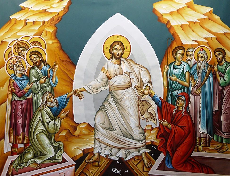 وهذا ما يفسّر ما نراه في النظرة الأولى للأيقونة. يسوع، في مجده، يتوسّط الأيقونة ويُخْرِج آدم وحوّاء من القبر، أي أنّه يُعتِقُ الجنس البشريّ بأكمله من سجن الخطيئة. قوّة القيامة ليست بانتصار الكلمة -وهو الإله الأزليّ- على الموت، بل بانتصار الإنسان على الخطيئة، لأنّ الأقنوم الثاني من الثالوث قال للبشريّة جمعاء ما قاله للمخلّع: “قم، احمل سريرك وامشِ!”.