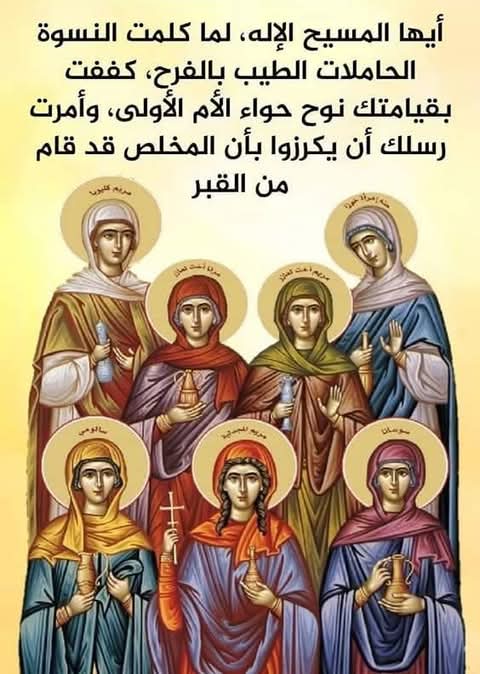 فلنقتدِ بمثالهن وشجاعتهن حتى تغمر أرواحنا أيضًا بنور القيامة الذي سنشهد له يوميًا من خلال أسلوب وطريقة حياتنا اليومية حتى آخر لحظة من أنفاسنا الأخيرة. لذلك، لندعُ الرب القائم من بين الأموات أن يؤهِّلنا للتمتُّع جميعًا بفرح قيامته الحقيقي والدائم، وأن نكون شهودًا على قيامتنا أيضًا.
