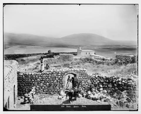 قرية نين في مرج ابن عامر عام 1900. بالخلفية كنيسة ابن الارملة وجبل الطور