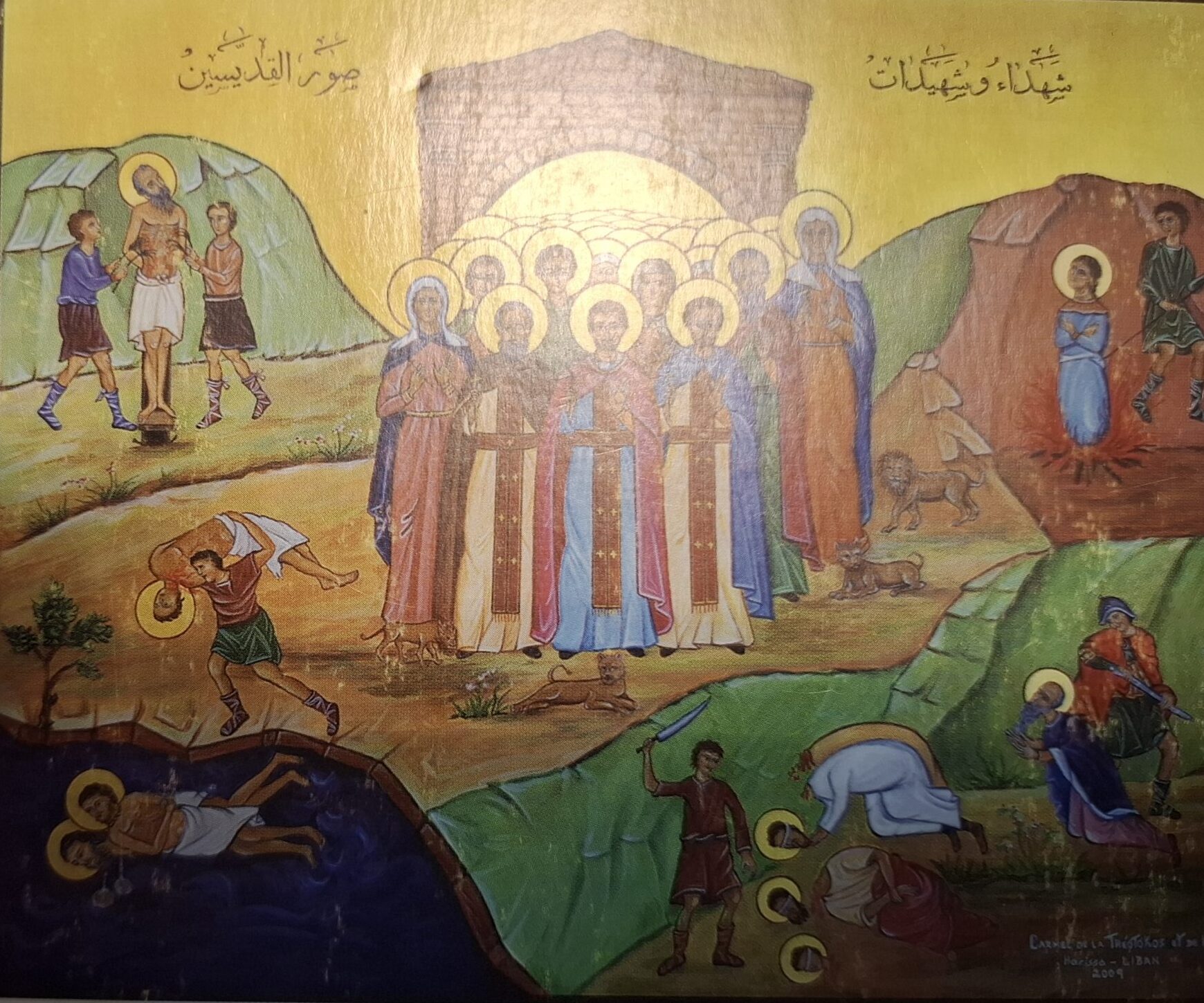 المحتفل: تباركت، أيُّها المسيح الفادي، يا مَنْ رَآكَ الشُّهَدَاءُ مُعَلَّقًا على خشبة العار، باذِلاً نَفْسَكَ عَنِ البشر، فارتَوَوا من الدَّم والماء الفائضَين من جنبك الطاهر . وَلَقَدْ أَيَّدتَهُم بِرُوحِكَ القدُّوس، فانتَصَرُوا ونالُوا مِنْ يَدِكَ إكليل المَجدِ الأَبَدِيّ. أَهِّلْنا أَن نحْتَفِلَ اليَوْمَ بِتَذْكارِهم، ونتأمَّلَ في جِهادِهِم ضدَّ النَّار والحَدِيدِ، فنَهْتِفَ لَهُم مُنْشِدِين: